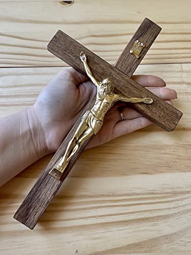 Catholic Mercy 11″ Wall Crucifix Wood Brown with Gold Corpus Handmade USA Decor Cross Crucifijo