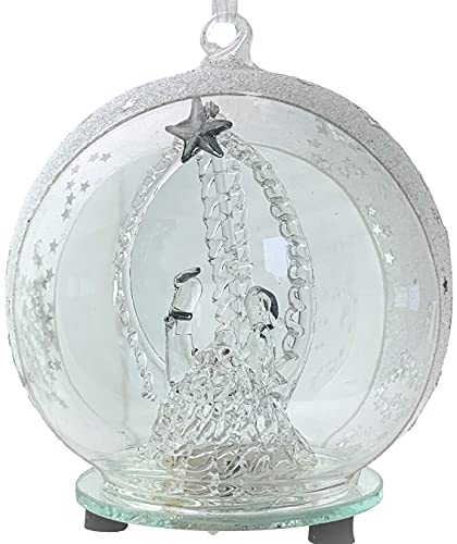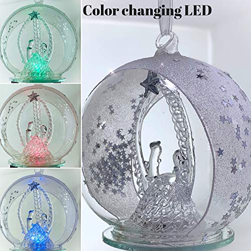 Holy Circle of relatives Nativity LED illuminate Christmas ornament with Mary, Joseph, Baby Jesus inside a color changing lighted glass ball. Colors change red to green to blue and repeat. This tree decoration with silver accents is versatile in that it might sit down on a shelf or hang in your Christmas tree. Use with your holiday centerpieces, mantle décor, and buffet decorations. It’s 4″ diameter, battery operated and includes batteries.